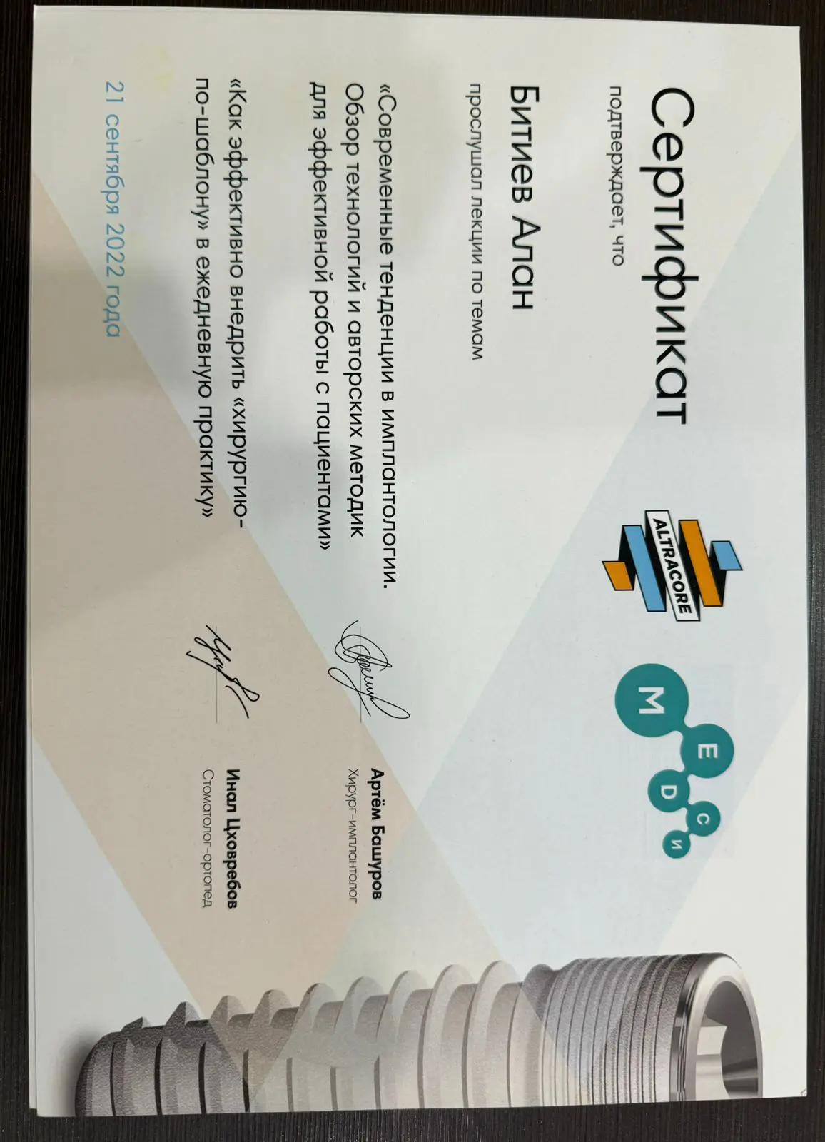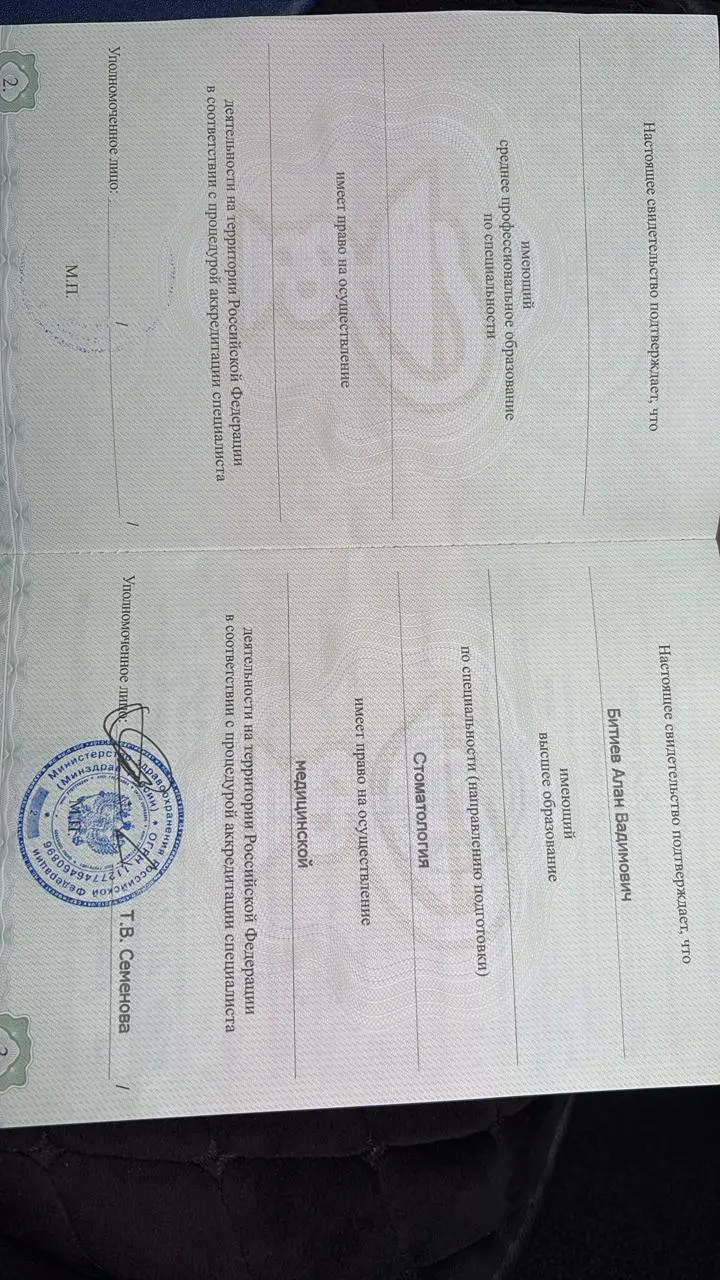 - 2020 г. — Северо-Осетинская государственная медицинская академия, клиническая ординатура по специальности «Ортопедическая стоматология»