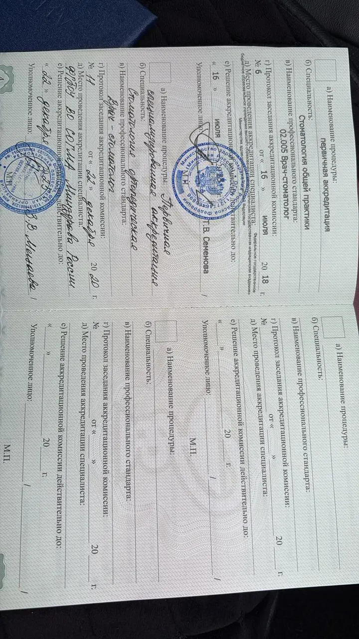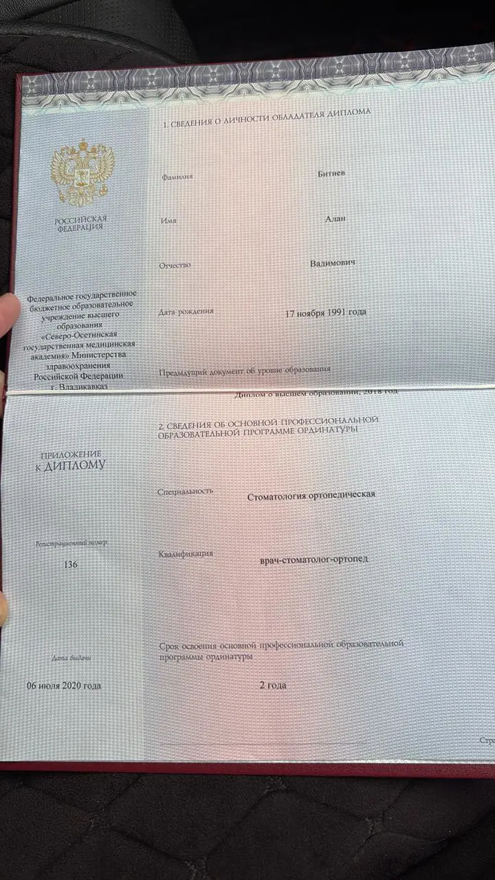 - 2018 г. — Северо-Осетинская государственная медицинская академия, специальность «Стоматология»