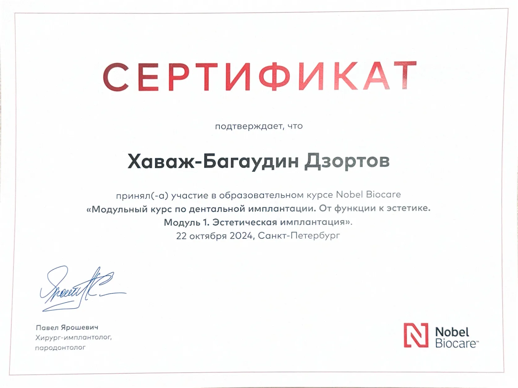 2024 «Модульный курс по дентальной имплантации. Эстетическая имплантация». Nobel Biocare Автор курса: Павел Ярошевич