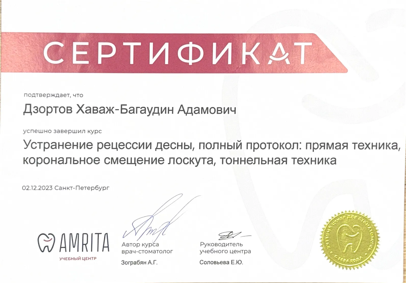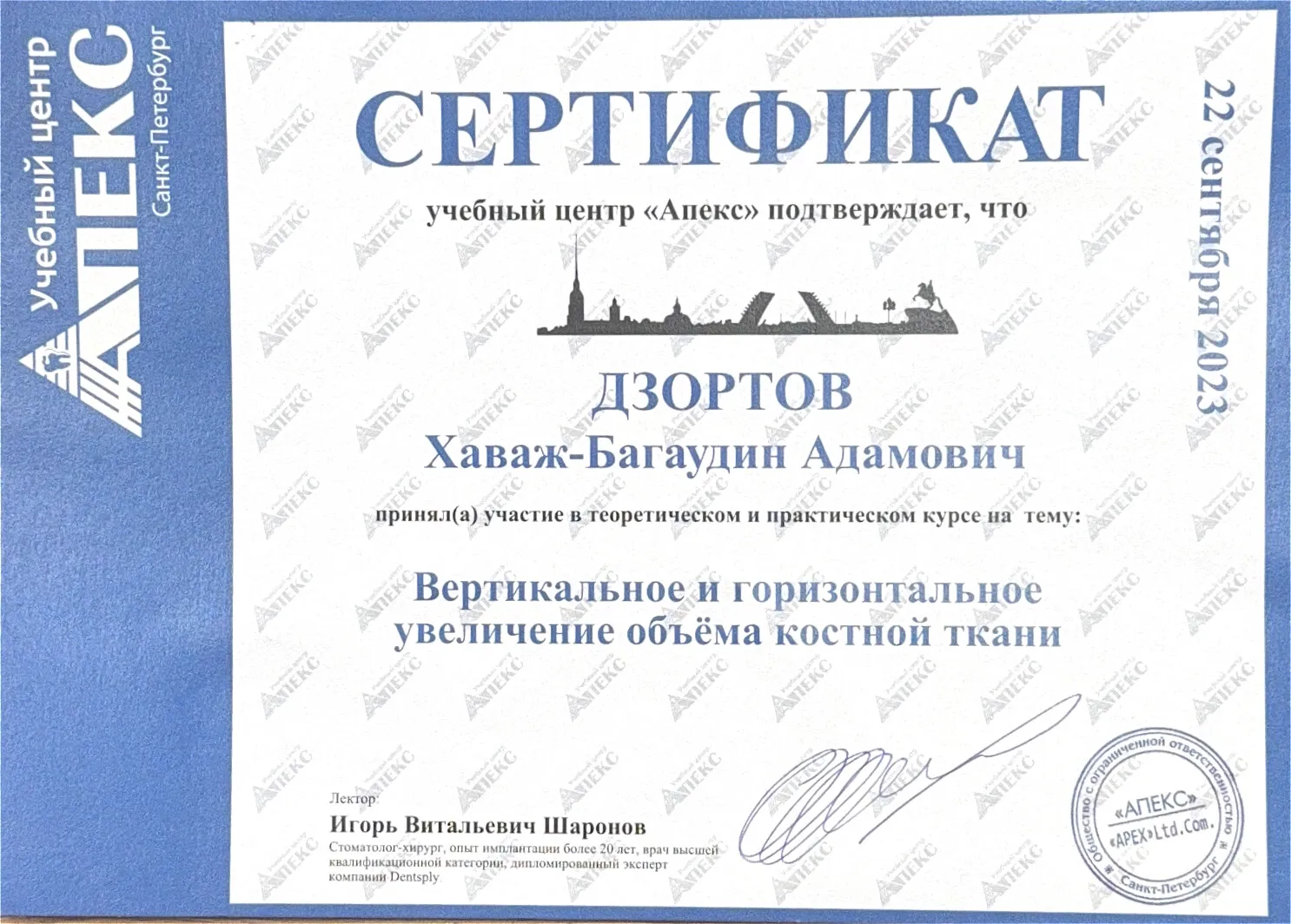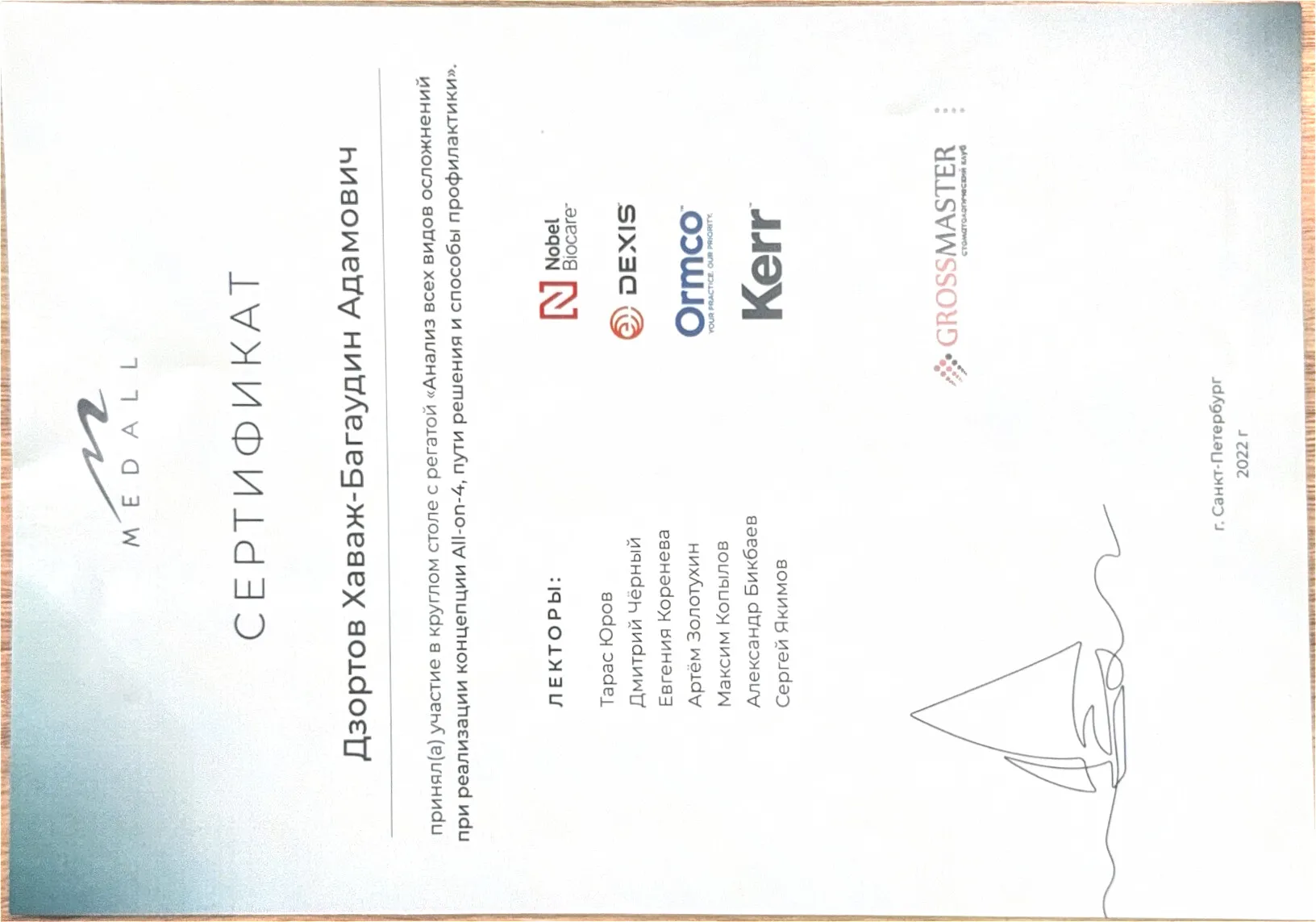 2024 «Модульный курс по дентальной имплантации. От функции эстетики. Синус-лифтинг: командный подход лора и имплантолога». Nobel Biocare Автор курса: Павел Ярошевич
