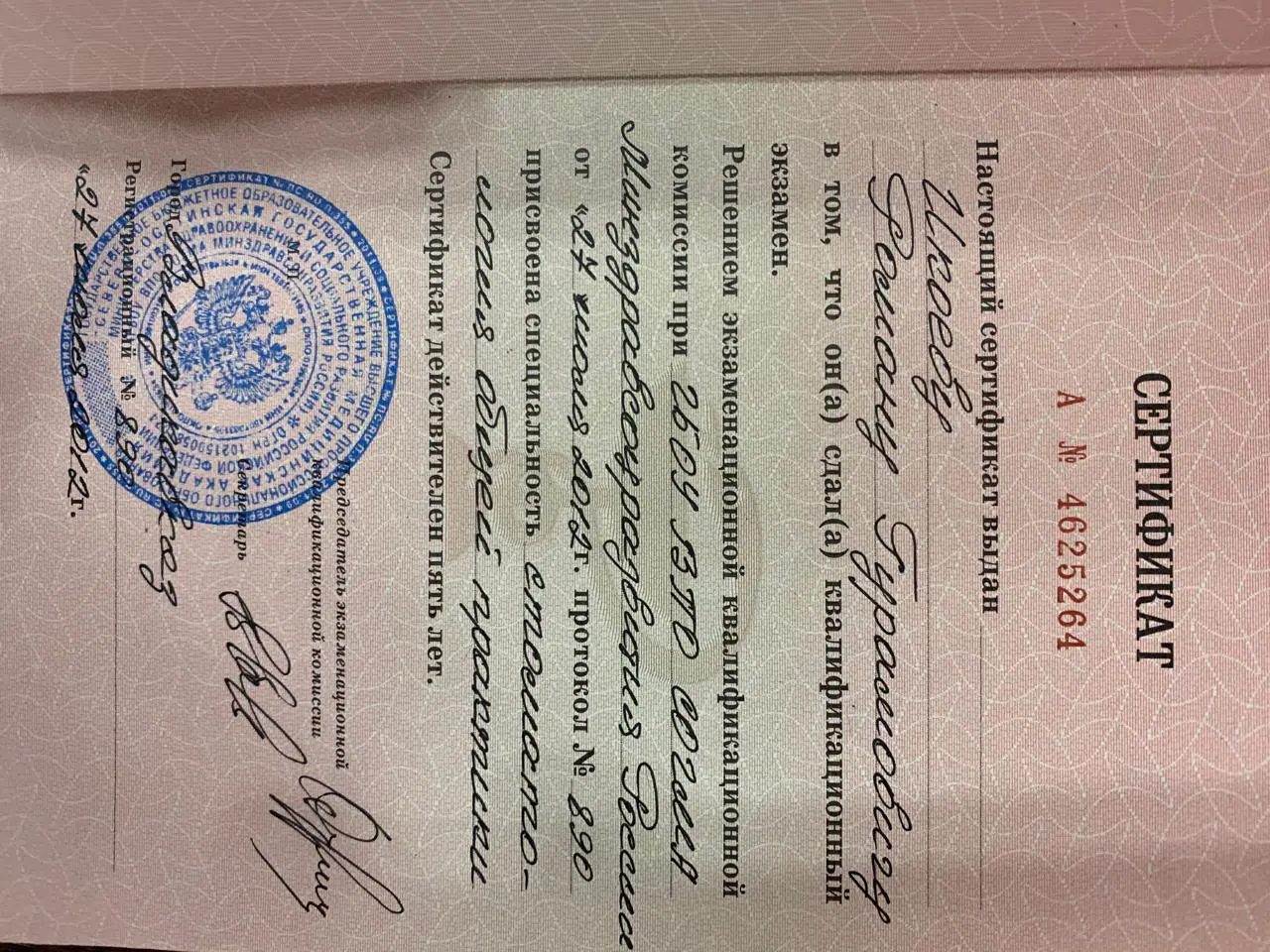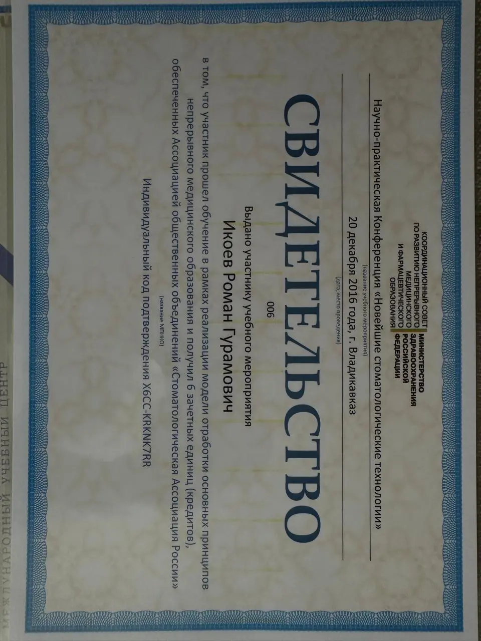 - 2020 г. — Сибирский институт непрерывного медицинского образования, «Стоматология ортопедическая»