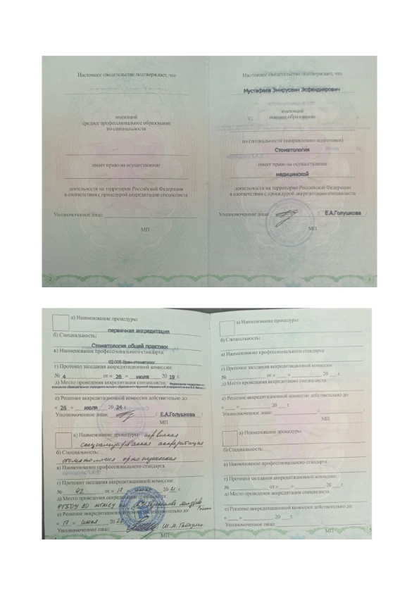 - 2019–2021 гг. — МГМСУ им Е. И. Евдокимова по специальности «стоматология ортопедическая»