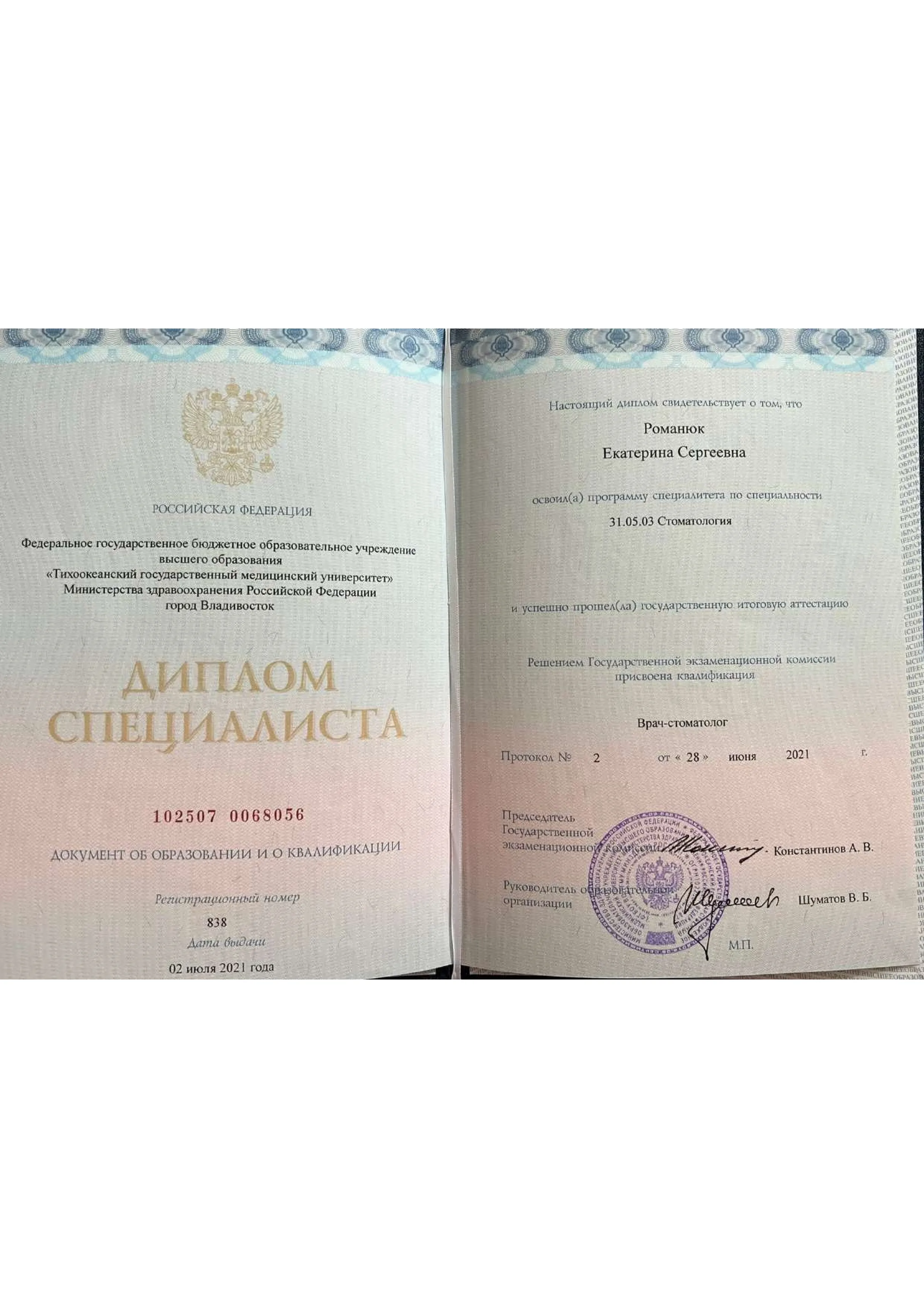 - Специалитет: Тихоокеанский Государственный Медицинский Университет (ТГМУ). Врач-стоматолог (2021 год)