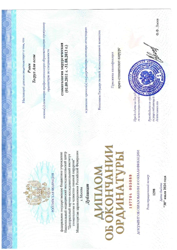 - 2013 г. — Центральный НИИ стоматологии и челюстно-лицевой хирургии, ординатура по «Стоматологии хирургической»