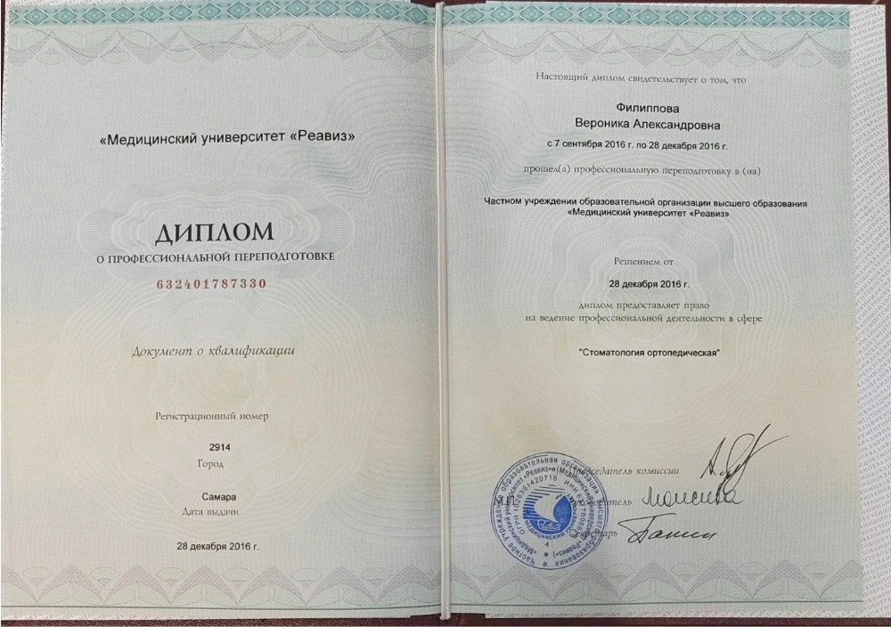 2016 — Самарский университет «Реавиз» профессиональная переподготовка «Стоматология ортопедическая»