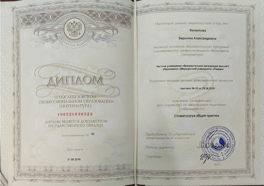 - 2015 — Северо-Западный государственный медицинский университет им. И. И. Мечникова, Стоматология общей практики, Интернатура